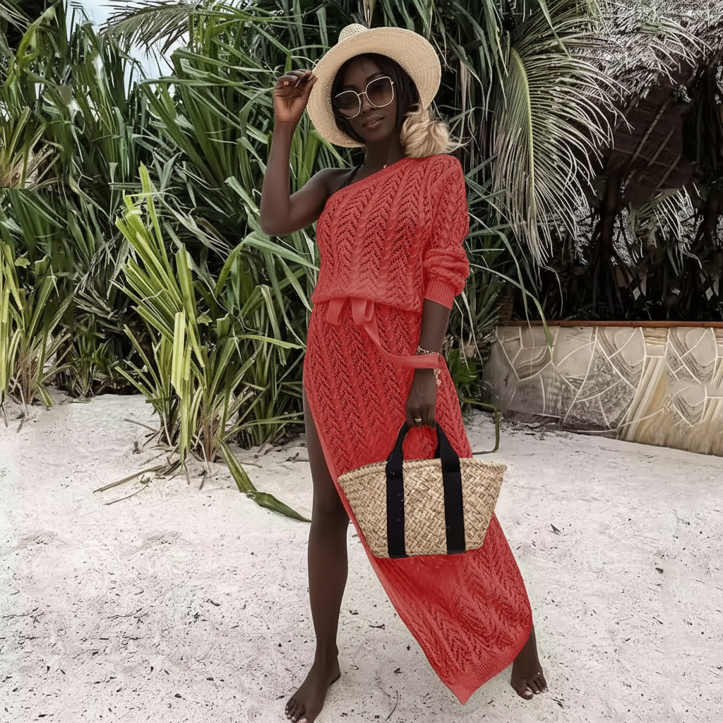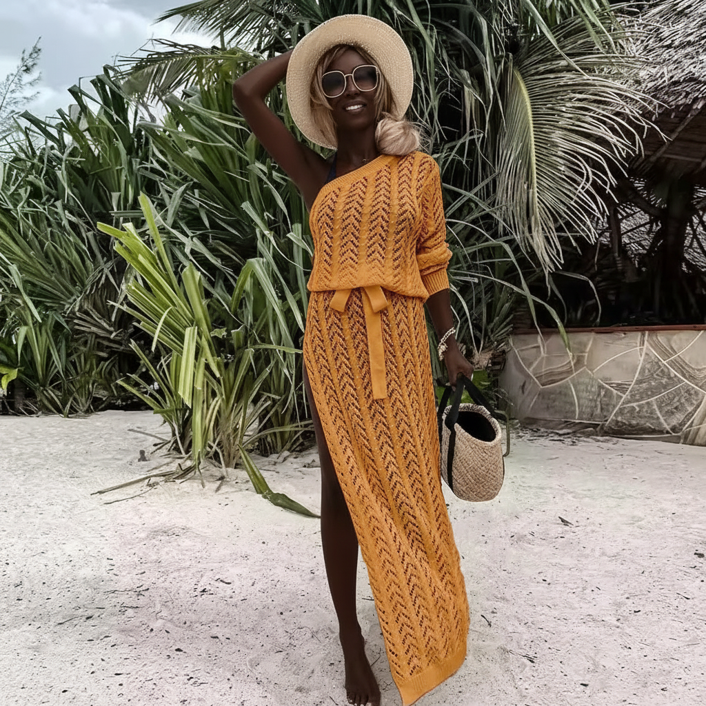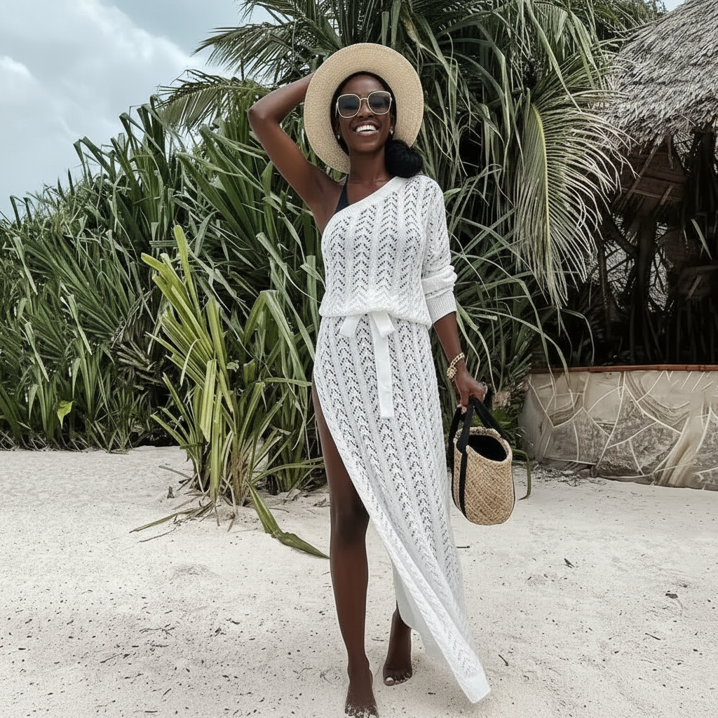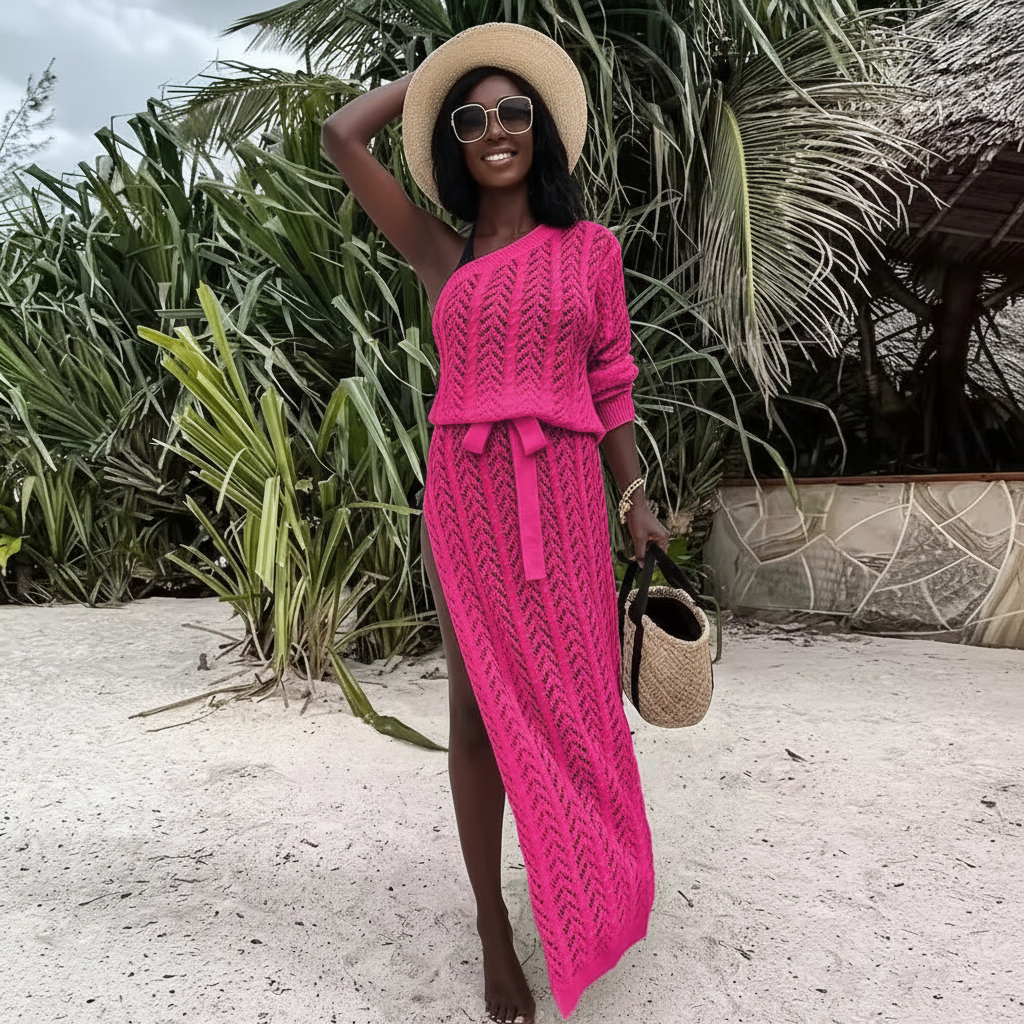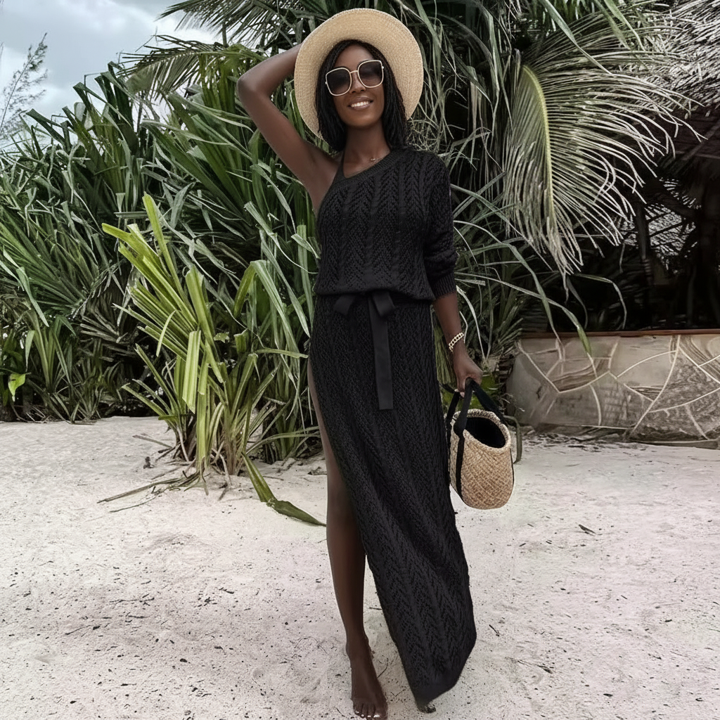 A stylish lightweight knit maxi cover up featuring a flattering side slit and adjustable waist tie. Perfect for beach days, vacations, and effortless summer styling.